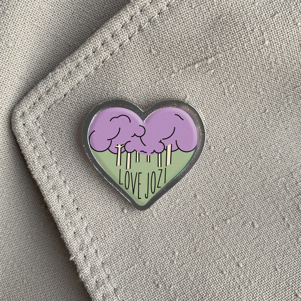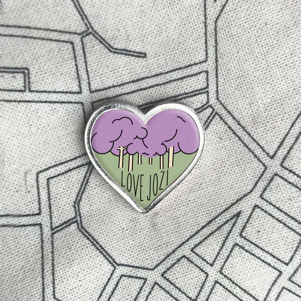 A reminder of your Love for Jozi on a 3cm wide heart-shaped metal pin with a domed graphic insert. Other designs to choose from are You Make Me Melt and But Really Now.