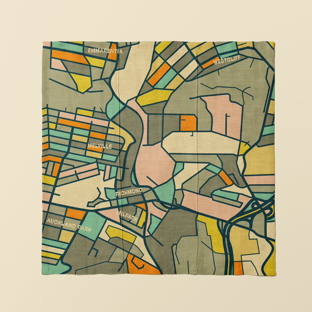 A set of four different napkins that fit together to form a map of Johannesburg's city centre and surrounding suburbs.