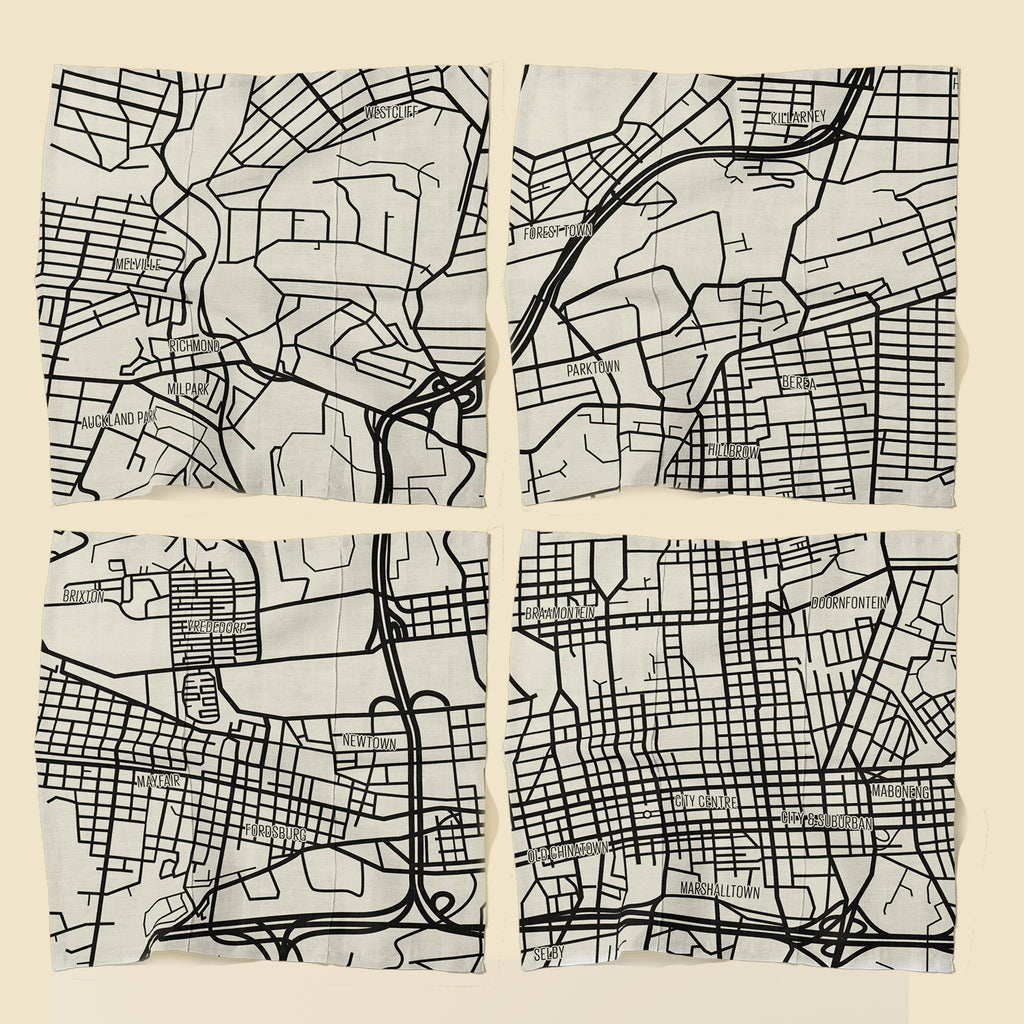 A set of four different napkins that fit together to form a map of Johannesburg's city centre and surrounding suburbs.