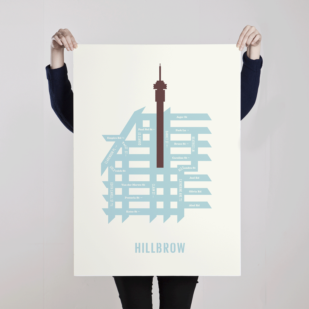 Stylised graphics of the areas around Johannesburg's iconic Telkom Tower in Hillbrow, and Sentech Tower in Brixton.